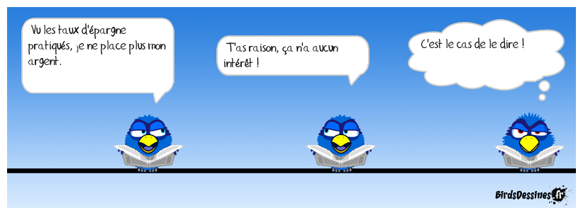 Case 1:Bird 1: Vu les taux d'épargne pratiqués, je ne place plus mon argent. | Case 2: Bird 1: T'as raison, ça n'a aucun intérêt ! | Case 3: Bird 1: C'est le cas de le dire !
