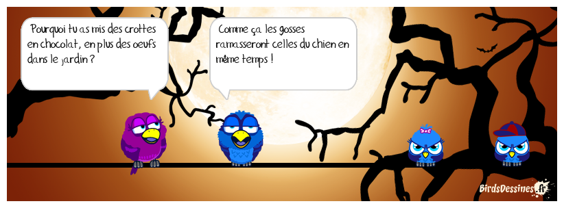 Case 1:Bird 1: Pourquoi tu as mis des crottes en chocolat, en plus des oeufs dans le jardin ? | Case 2: Bird 1: Comme ça les gosses ramasseront celles du chien en même temps ! | Case 3: