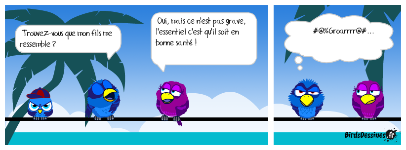 Case 1:Bird 1: Trouvez-vous que mon fils me ressemble ? | Case 2: Bird 1: Oui, mais ce n'est pas grave, l'essentiel c'est qu'il soit en bonne santé ! | Case 3: Bird 1: #@%Groarrrr@#...