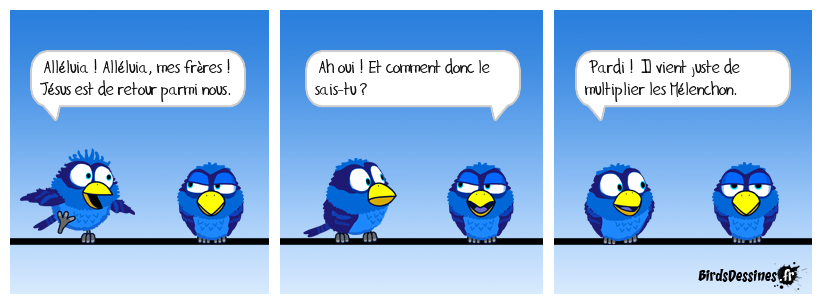 Case 1:Bird 1: Alléluia ! Alléluia, mes frères ! Jésus est de retour parmi nous. | Case 2: Bird 1: Ah oui ! Et comment donc le sais-tu ? | Case 3: Bird 1: Pardi ! Il vient juste de multiplier les Mélenchon.