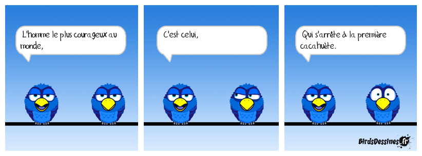 Case 1:Bird 1: L'homme le plus courageux au monde, | Case 2: Bird 1: C'est celui, | Case 3: Bird 1: Qui s'arrête à la première cacahuète.