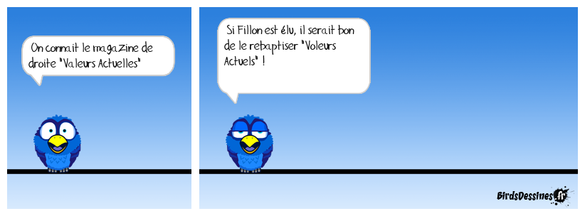 Case 1:Bird 1: On connait le magazine de droite "Valeurs Actuelles" | Case 2: Bird 1: Si Fillon est élu, il serait bon de le rebaptiser "Voleurs Actuels" ! | Case 3: