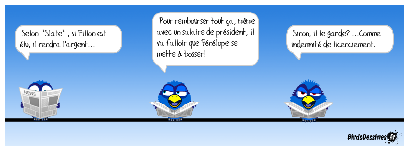 Case 1:Bird 1: Selon "Slate" , si Fillon est élu, il rendra l'argent... | Case 2: Bird 1: Pour rembourser tout ça, même avec un salaire de président, il va falloir que Pénélope se mette à bosser! | Case 3: Bird 1: Sinon, il le garde? ...Comme indemnité de licenciement.