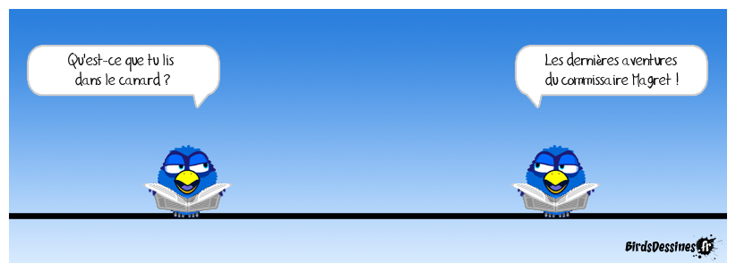 Case 1:Bird 1: Qu'est-ce que tu lis dans le canard ? | Case 2: | Case 3: Bird 1: Les dernières aventures du commissaire Magret !
