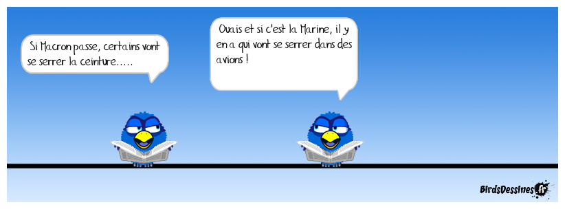 Case 1:Bird 1: Si Macron passe, certains vont se serrer la ceinture..... | Case 2: Bird 1: Ouais et si c'est la Marine, il y en a qui vont se serrer dans des avions ! | Case 3: