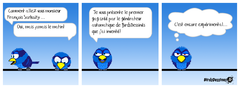 Case 1:Bird 1: Comment allez vous monsieur François Sarkozy ...Bird 2: Oui, mais jamais le matin! | Case 2: Bird 1: Je vous présente le premier gag créé par le générateur automatique de BirdsDessinés que j'ai inventé! | Case 3: Bird 1: C'est encore expérimental...