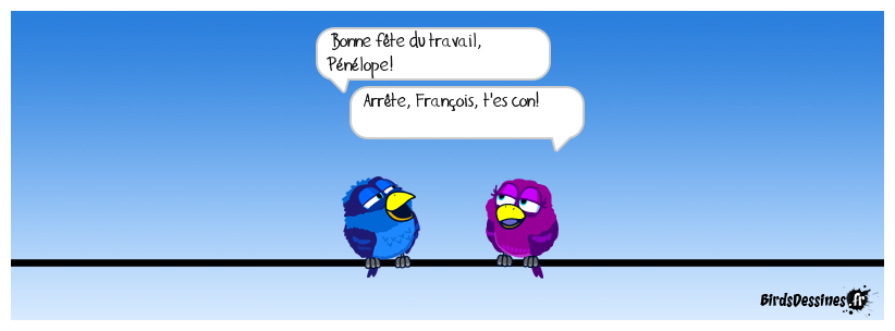 Case 1: | Case 2: Bird 1: Bonne fête du travail, Pénélope! Bird 2: Arrête, François, t'es con! | Case 3: