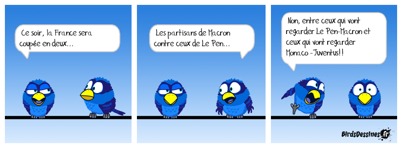 Case 1:Bird 1: Ce soir, la France sera coupée en deux... | Case 2: Bird 1: Les partisans de Macron contre ceux de Le Pen... | Case 3: Bird 1: Non, entre ceux qui vont regarder Le Pen-Macron et ceux qui vont regarder Monaco -Juventus!!