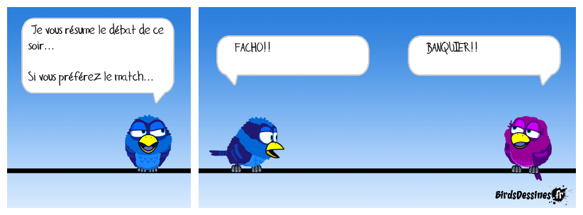 Case 1:Bird 1: Je vous résume le débat de ce soir... Si vous préférez le match... | Case 2: Bird 1: FACHO!! | Case 3: Bird 1: BANQUIER!!