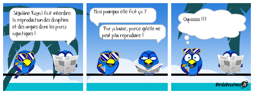 Case 1:Bird 1: Ségolène Royal fait interdire la reproduction des dauphins et des orques dans les parcs aquatiques ! | Case 2: Bird 1: Mais pourquoi elle fait ça ? Bird 2: Par jalousie, parce qu'elle ne peut plus reproduire ! | Case 3: Bird 1: Oupssssss !!!