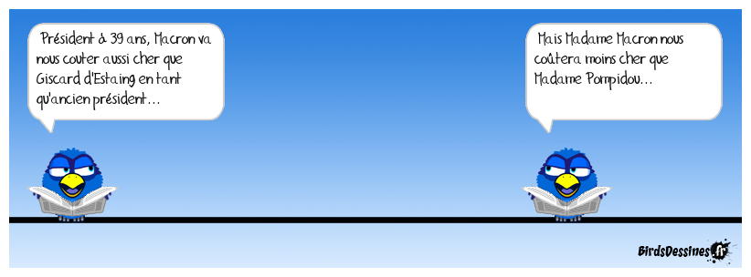 Case 1:Bird 1: Président à 39 ans, Macron va nous couter aussi cher que Giscard d'Estaing en tant qu'ancien président... | Case 2: | Case 3: Bird 1: Mais Madame Macron nous coûtera moins cher que Madame Pompidou...