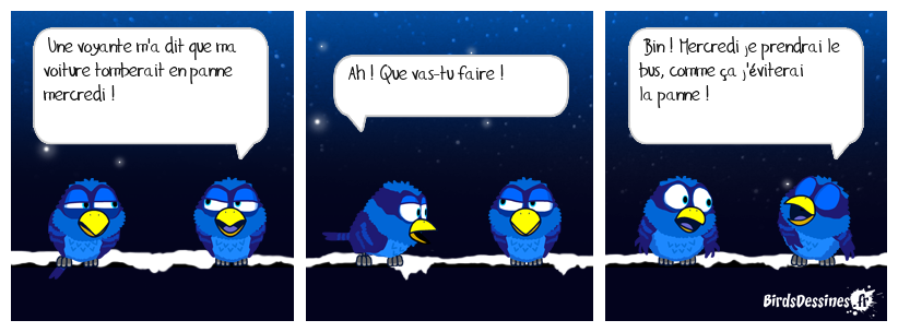 Case 1:Bird 1: Une voyante m'a dit que ma voiture tomberait en panne mercredi ! | Case 2: Bird 1: Ah ! Que vas-tu faire ! | Case 3: Bird 1: Bin ! Mercredi je prendrai le bus, comme ça j'éviterai la panne !