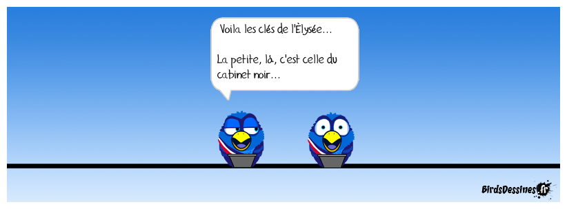 Case 1: | Case 2: Bird 1: Voila les clés de l'Élysée... La petite, là, c'est celle du cabinet noir... | Case 3: