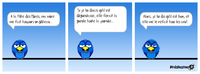 Case 1:Bird 1: A la Fête des Mères, ma mère me fait toujours un gâteau.. | Case 2: Bird 1: Si je lui disais qu'il est dégueulasse, elle ferait la gueule toute la journée.. | Case 3: Bird 1: Alors, je lui dis qu'il est bon, et elle me le refait tous les ans!
