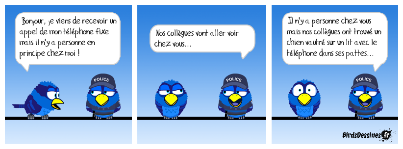Case 1:Bird 1: Bonjour, je viens de recevoir un appel de mon téléphone fixe mais il n'y a personne en principe chez moi ! | Case 2: Bird 1: Nos collègues vont aller voir chez vous... | Case 3: Bird 1: Il n'y a personne chez vous mais nos collègues ont trouvé un chien vautré sur un lit avec le téléphone dans ses pattes...