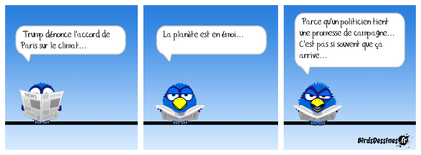 Case 1:Bird 1: Trump dénonce l'accord de Paris sur le climat... | Case 2: Bird 1: La planète est en émoi... | Case 3: Bird 1: Parce qu'un politicien tient une promesse de campagne... C'est pas si souvent que ça arrive...
