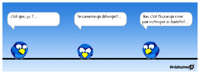 Case 1:Bird 1: c'est quoi, ça ?... | Case 2: Bird 1: Un comorien qui débarque?... | Case 3: Bird 1: Non, c'est Macron qui rame pour rattraper sa boulette!...
