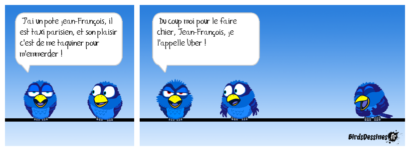 Case 1:Bird 1: J'ai un pote jean-François, il est taxi parisien, et son plaisir c'est de me taquiner pour m'emmerder ! | Case 2: Bird 1: Du coup moi pour le faire chier, Jean-François, je l'appelle Uber ! | Case 3: