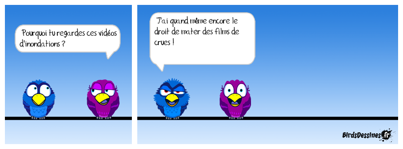 Case 1:Bird 1: Pourquoi tu regardes ces vidéos d'inondations ? | Case 2: Bird 1: J'ai quand même encore le droit de mater des films de crues ! | Case 3: