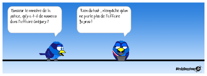 Case 1:Bird 1: Monsieur le ministre de la justice, qu'y a-t-il de nouveau dans l'affaire Grégory ? | Case 2: Bird 1: Rien du tout , n'empêche qu'on ne parle plus de l'affaire Bayrou ! | Case 3: