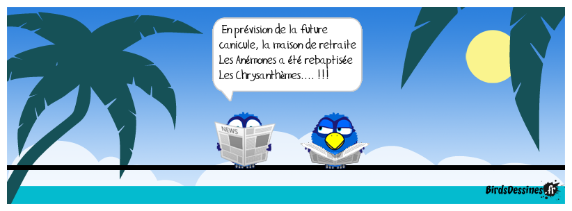 Case 1: | Case 2: Bird 1: En prévision de la future canicule, la maison de retraite Les Anémones a été rebaptisée Les Chrysanthèmes.... !!! | Case 3: