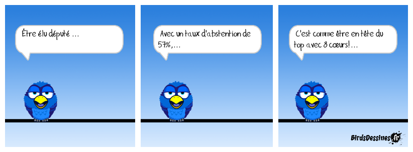 Case 1:Bird 1: Être élu député ... | Case 2: Bird 1: Avec un taux d'abstention de 57%,... | Case 3: Bird 1: C'est comme être en tête du top avec 8 cœurs!...
