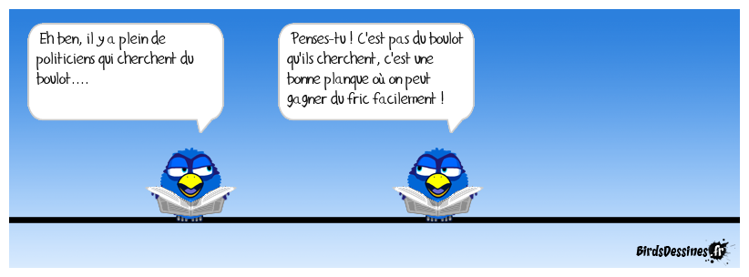 Case 1:Bird 1: Eh ben, il y a plein de politiciens qui cherchent du boulot.... | Case 2: Bird 1: Penses-tu ! C'est pas du boulot qu'ils cherchent, c'est une bonne planque où on peut gagner du fric facilement ! | Case 3:
