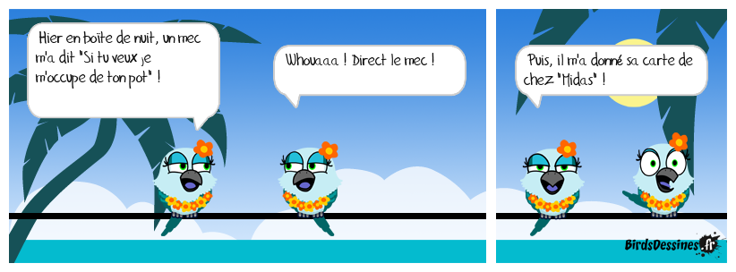 Case 1:Bird 1: Hier en boîte de nuit, un mec m'a dit "Si tu veux je m'occupe de ton pot" ! | Case 2: Bird 1: Whouaaa ! Direct le mec ! | Case 3: Bird 1: Puis, il m'a donné sa carte de chez "Midas" !