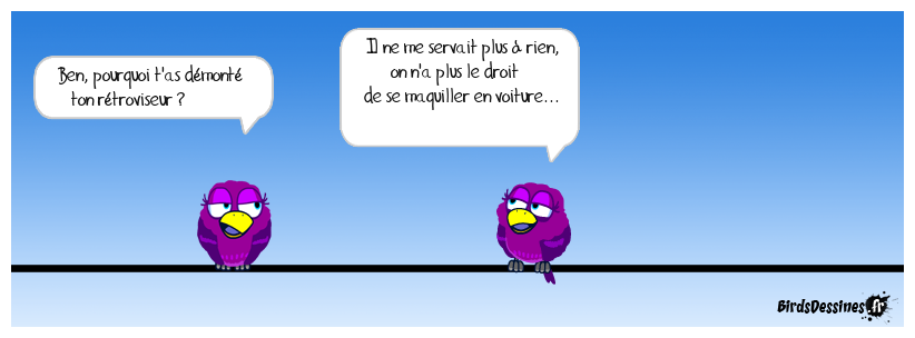 Case 1:Bird 1: Ben, pourquoi t'as démonté ton rétroviseur ? | Case 2: Bird 1: Il ne me servait plus à rien, on n'a plus le droit de se maquiller en voiture... | Case 3: