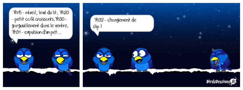 Case 1:Bird 1: 7h15 - réveil, levé du lit, 7h20 - petit café croissants,7h30 - gargouillement dans le ventre, 7h31 - expulsion d'un pet... | Case 2: Bird 1: 7h32 - changement de slip ! | Case 3: