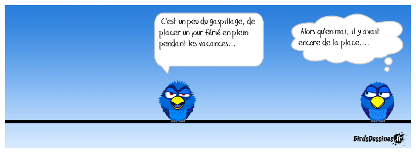 Case 1: | Case 2: Bird 1: C'est un peu du gaspillage, de placer un jour férié en plein pendant les vacances... | Case 3: Bird 1: Alors qu'en mai, il y avait encore de la place....