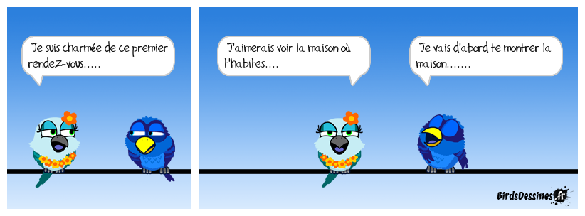 Case 1:Bird 1: Je suis charmée de ce premier rendez-vous..... | Case 2: Bird 1: J'aimerais voir la maison où t'habites.... | Case 3: Bird 1: Je vais d'abord te montrer la maison.......