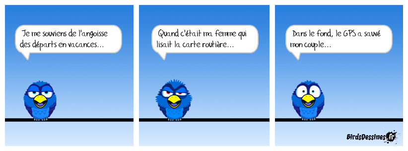 Case 1:Bird 1: Je me souviens de l'angoisse des départs en vacances... | Case 2: Bird 1: Quand c'était ma femme qui lisait la carte routière... | Case 3: Bird 1: Dans le fond, le GPS a sauvé mon couple...