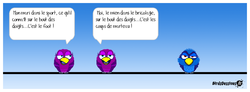 Case 1:Bird 1: Mon mari dans le sport, ce qu'il connaït sur le bout des doigts...C'est le foot ! | Case 2: Bird 1: Moi, le mien dans le bricolage, sur le bout des doigts...C'est les coups de marteau ! | Case 3: