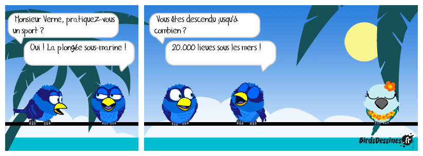 Case 1:Bird 1: Monsieur Verne, pratiquez-vous un sport ?Bird 2: Oui ! La plongée sous-marine ! | Case 2: Bird 1: Vous êtes descendu jusqu'à combien ? Bird 2: 20.000 lieues sous les mers ! | Case 3: