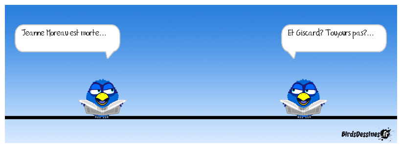 Case 1:Bird 1: Jeanne Moreau est morte... | Case 2: | Case 3: Bird 1: Et Giscard? Toujours pas?...