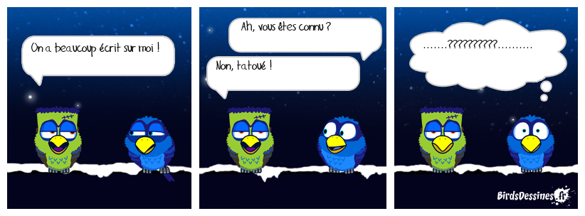 Case 1:Bird 1: On a beaucoup écrit sur moi ! | Case 2: Bird 1: Ah, vous êtes connu ? Bird 2: Non, tatoué ! | Case 3: Bird 1: .......??????????..........