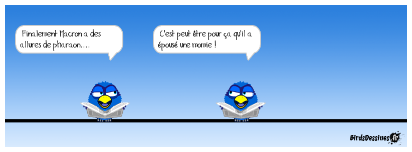 Case 1:Bird 1: Finalement Macron a des allures de pharaon.... | Case 2: Bird 1: C'est peut être pour ça qu'il a épousé une momie ! | Case 3: