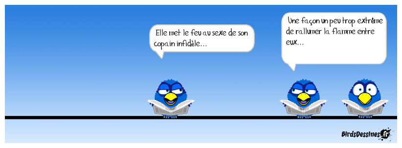 Case 1: | Case 2: Bird 1: Elle met le feu au sexe de son copain infidèle... | Case 3: Bird 1: Une façon un peu trop extrême de rallumer la flamme entre eux...