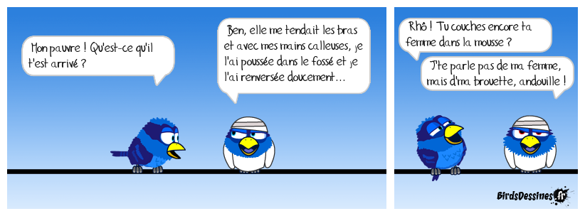 Case 1:Bird 1: Mon pauvre ! Qu'est-ce qu'il t'est arrivé ? | Case 2: Bird 1: Ben, elle me tendait les bras et avec mes mains calleuses, je l'ai poussée dans le fossé et je l'ai renversée doucement... | Case 3: Bird 1: Rhô ! Tu couches encore ta femme dans la mousse ? Bird 2: J'te parle pas de ma femme, mais d'ma brouette, andouille !