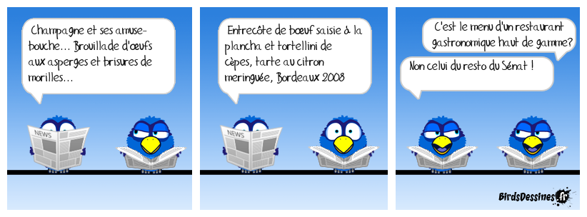 Case 1:Bird 1: Champagne et ses amuse- bouche... Brouillade d'œufs aux asperges et brisures de morilles... | Case 2: Bird 1: Entrecôte de bœuf saisie à la plancha et tortellini de cèpes, tarte au citron meringuée, Bordeaux 2008 | Case 3: Bird 1: C'est le menu d'un restaurant gastronomique haut de gamme? Bird 2: Non celui du resto du Sénat !