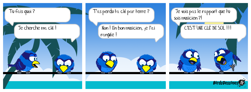 Case 1:Bird 1: Tu fais quoi ?Bird 2: Je cherche ma clé ! | Case 2: Bird 1: T'as perdu ta clé par terre ? Bird 2: Non ! En bon musicien, je l'ai rangée ! | Case 3: Bird 1: Je vois pas le rapport que tu sois musicien ?! Bird 2: C'EST UNE CLÉ DE SOL !!!