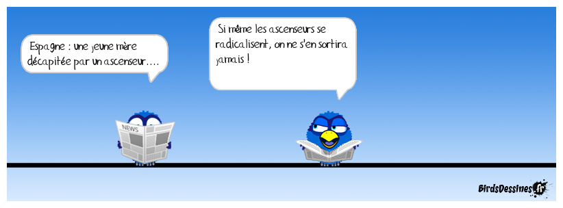 Case 1:Bird 1: Espagne : une jeune mère décapitée par un ascenseur.... | Case 2: Bird 1: Si même les ascenseurs se radicalisent, on ne s'en sortira jamais ! | Case 3: