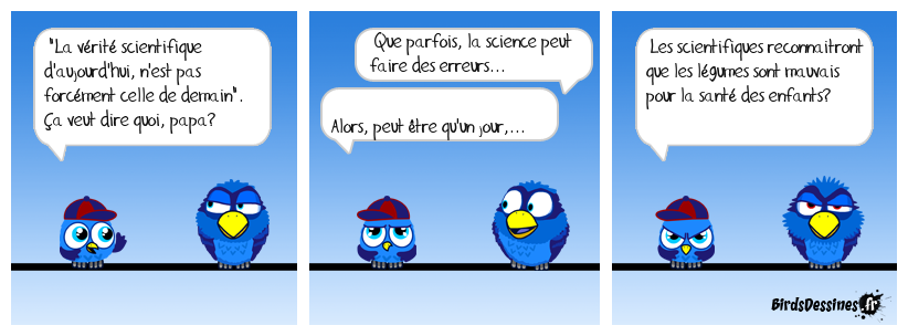 Case 1:Bird 1: "La vérité scientifique d'aujourd'hui, n'est pas forcément celle de demain". Ça veut dire quoi, papa? | Case 2: Bird 1: Que parfois, la science peut faire des erreurs... Bird 2: Alors, peut être qu'un jour,... | Case 3: Bird 1: Les scientifiques reconnaitront que les légumes sont mauvais pour la santé des enfants?