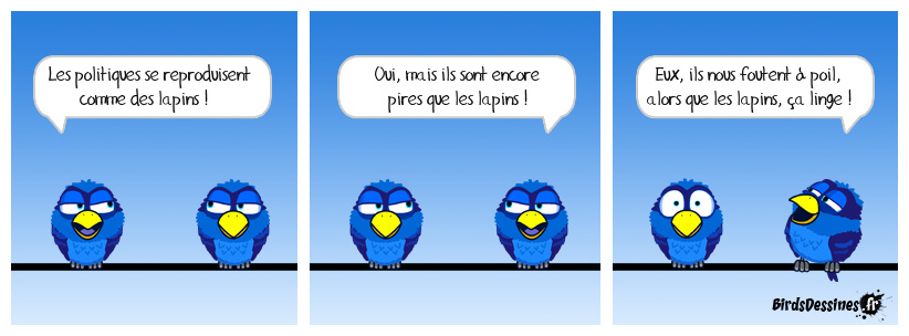 Case 1:Bird 1: Les politiques se reproduisent comme des lapins ! | Case 2: Bird 1: Oui, mais ils sont encore pires que les lapins ! | Case 3: Bird 1: Eux, ils nous foutent à poil, alors que les lapins, ça linge !