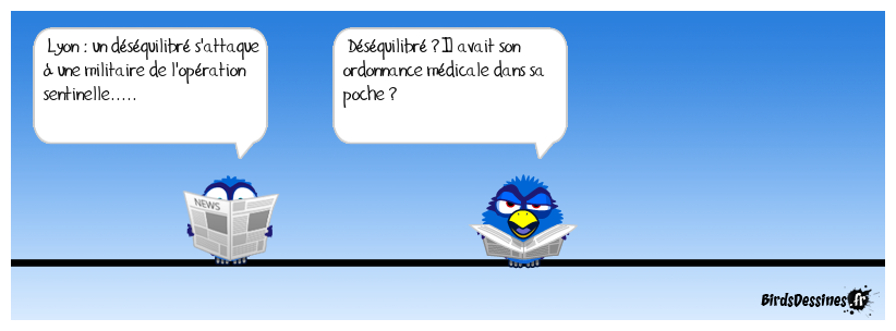 Case 1:Bird 1: Lyon : un déséquilibré s'attaque à une militaire de l'opération sentinelle..... | Case 2: Bird 1: Déséquilibré ? Il avait son ordonnance médicale dans sa poche ? | Case 3: