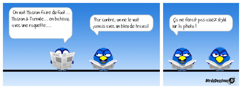 Case 1:Bird 1: On voit Macron faire du foot... Macron à l'armée... en bateau, avec une raquette.... | Case 2: Bird 1: Par contre, on ne le voit jamais avec un bleu de travail | Case 3: Bird 1: Ça ne ferait pas assez stylé sur la photo !