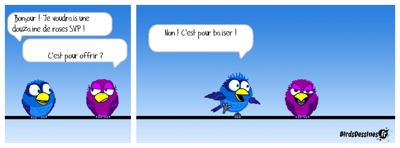 Case 1:Bird 1: Bonjour ! Je voudrais une douzaine de roses SVP !Bird 2: C'est pour offrir ? | Case 2: Bird 1: Non ! C'est pour baiser ! | Case 3: