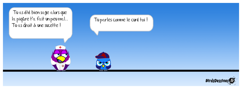 Case 1:Bird 1: Tu as été bien sage alors que la piqûre t'a fait un peu mal.. Tu as droit à une sucette ! | Case 2: Bird 1: Tu parles comme le curé toi ! | Case 3: