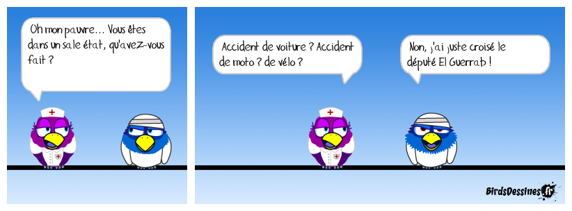 Case 1:Bird 1: Oh mon pauvre... Vous êtes dans un sale état, qu'avez-vous fait ? | Case 2: Bird 1: Accident de voiture ? Accident de moto ? de vélo ? | Case 3: Bird 1: Non, j'ai juste croisé le député El Guerrab !